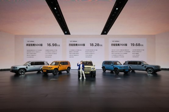 V27采用未来经典设计理念,融合经典越野姿态与精致科技质感,超5米车身搭配近1:1宽高比勾勒出硬派轮廓;首创的星舰座舱设计,依托2910mm长轴距与69.9%的空间得房率,打造通透宽敞的大五座体验,星际舷窗双天幕、天空岛顶棚与50余处储物设计,让个性风格与家庭实用完美融合。